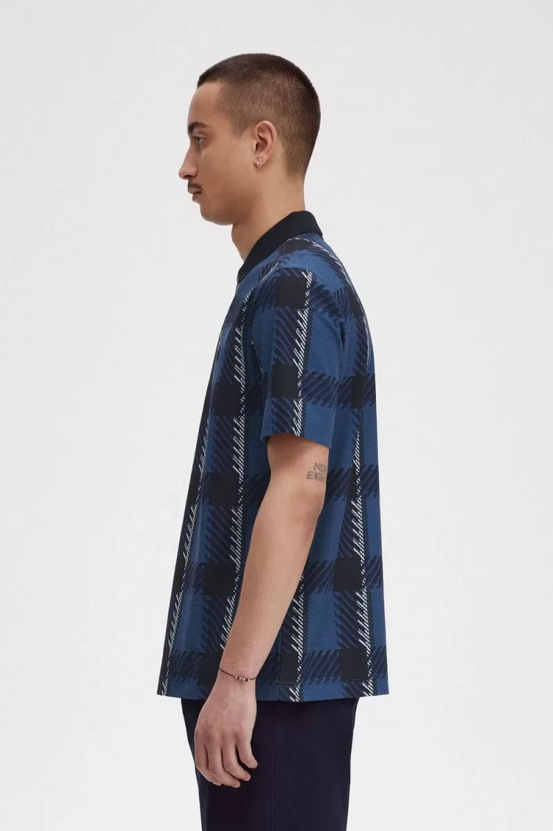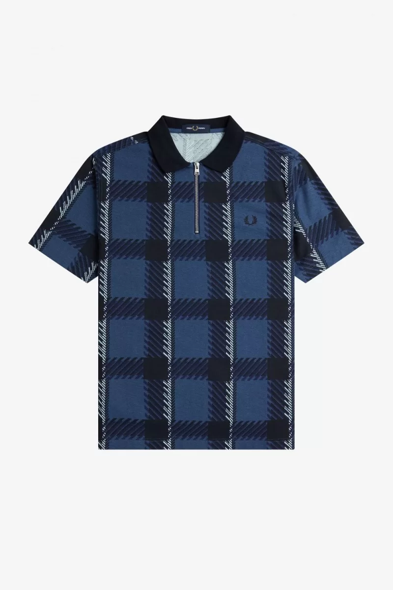 Fred Perry Glitch Tartan Zip Neck Men’s Polo Shirt Midnight Blue PDNYI5619
